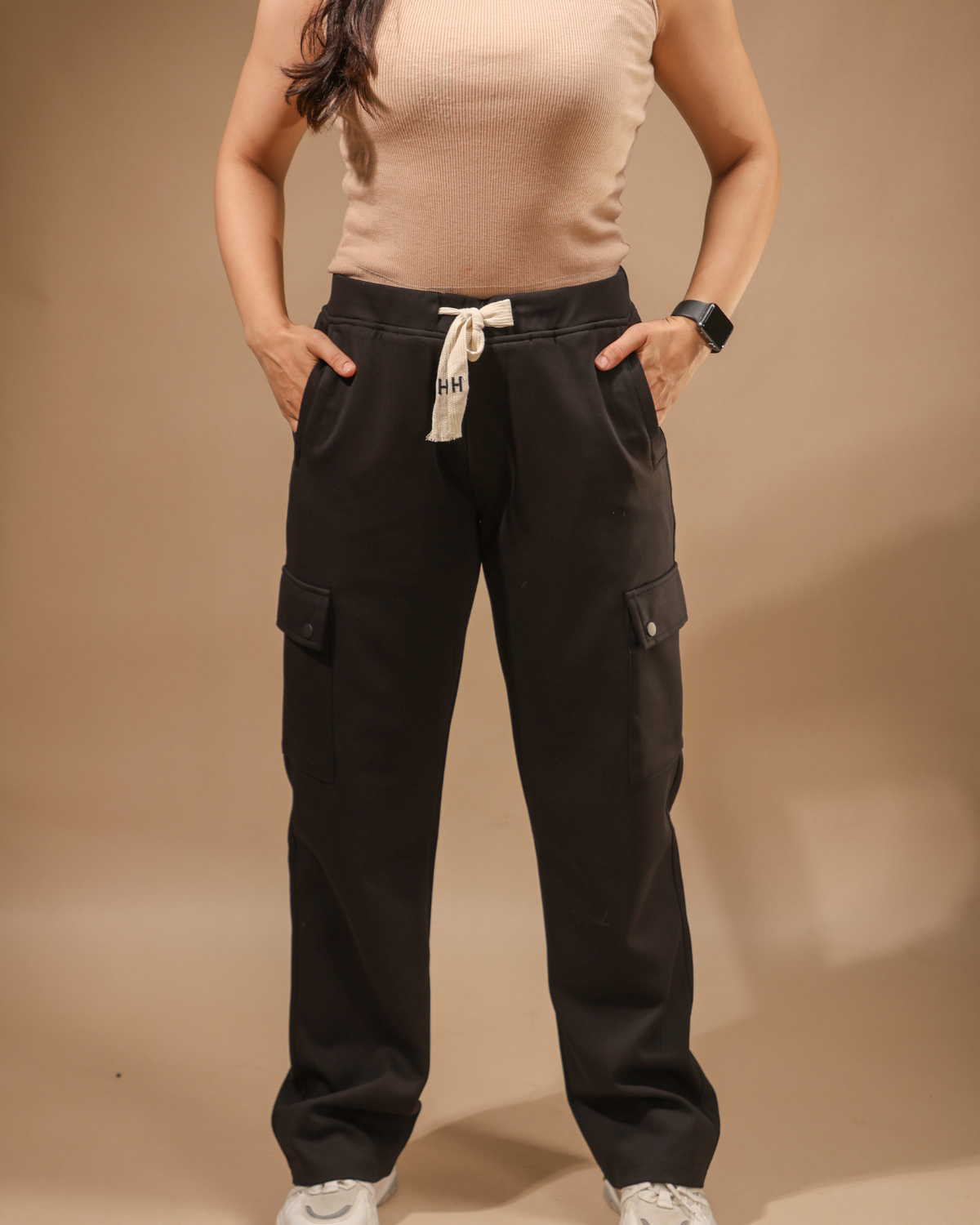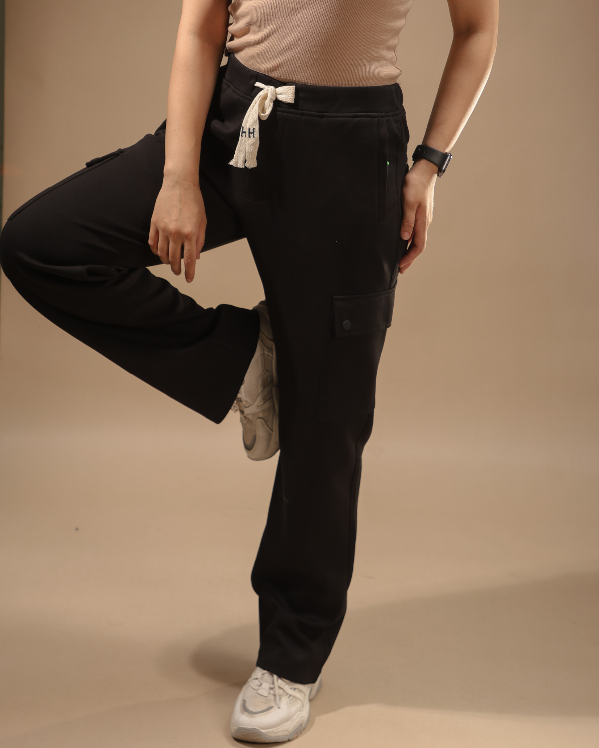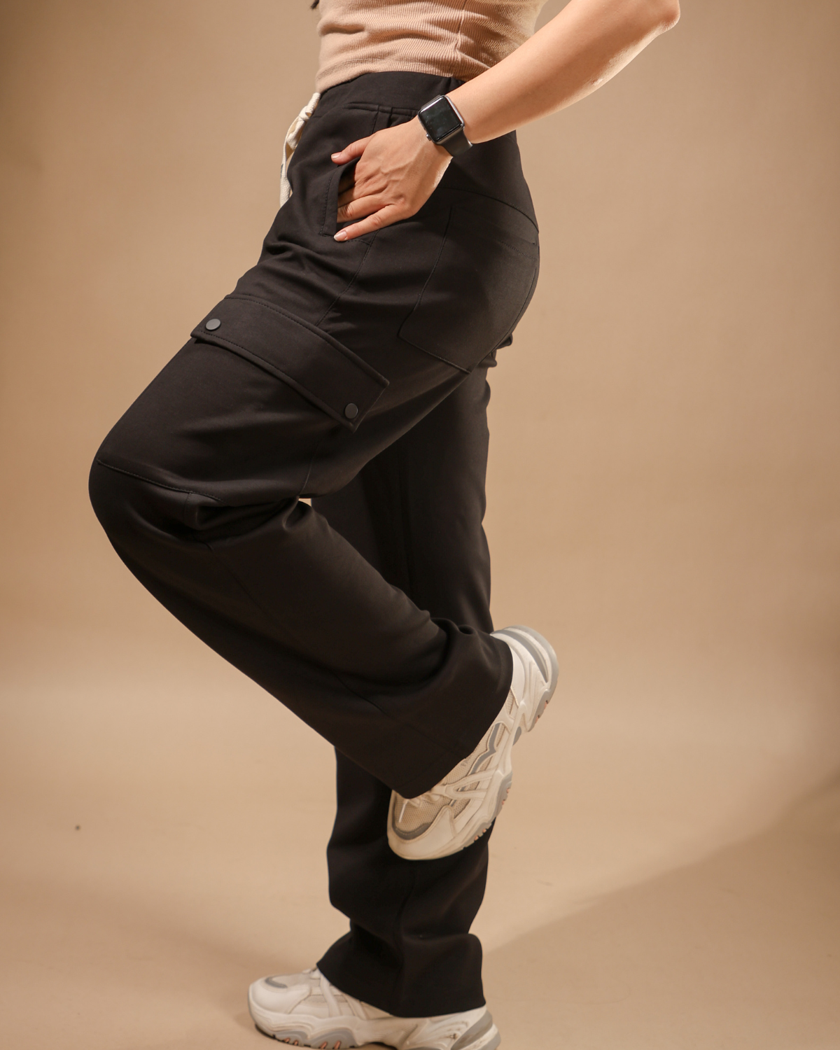 Modern meets retro with scuba-soft fabric and bell bottom flare. Functional cargo pockets add utility and flair.
